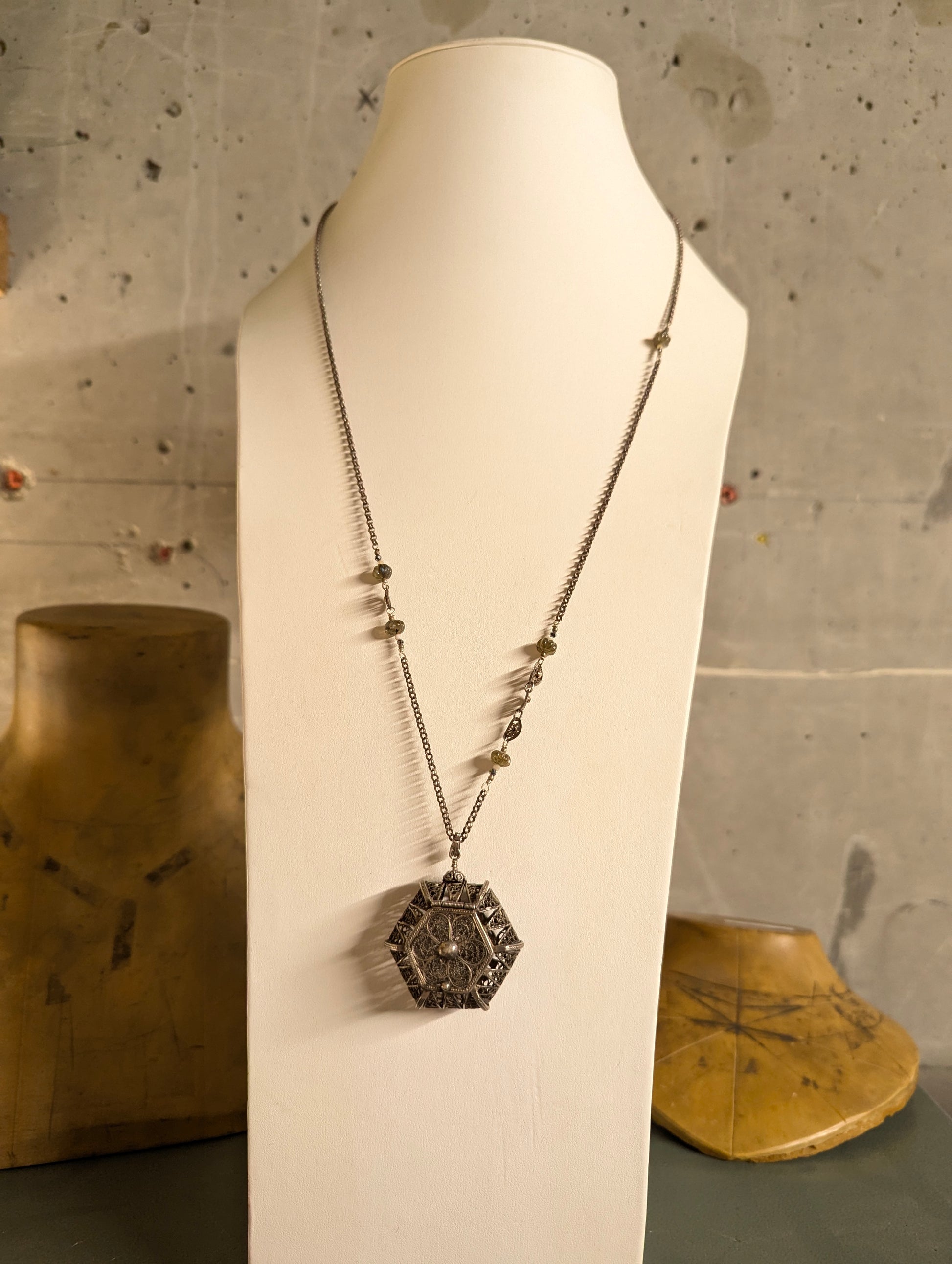 シルバーの繊細なレース模様のペンダントトップは19世紀のピルケース。チェーンは懐中時計に使われてたものに、天然石のラブラドライト、ヘマタイトを組み込んでいます。軽くてとてもつけやすく、とにかく素敵に目立ちます。ピルケース部分は閉まるので、小さなものを忍ばせてみることもできますよ。