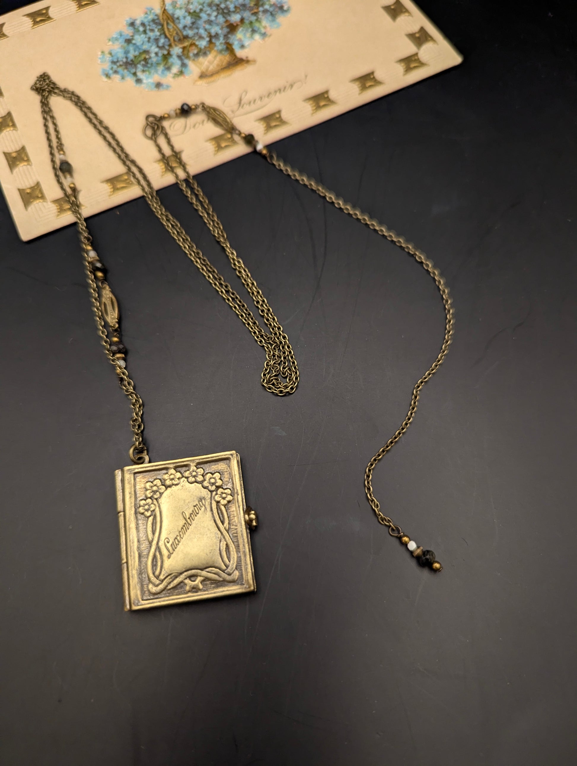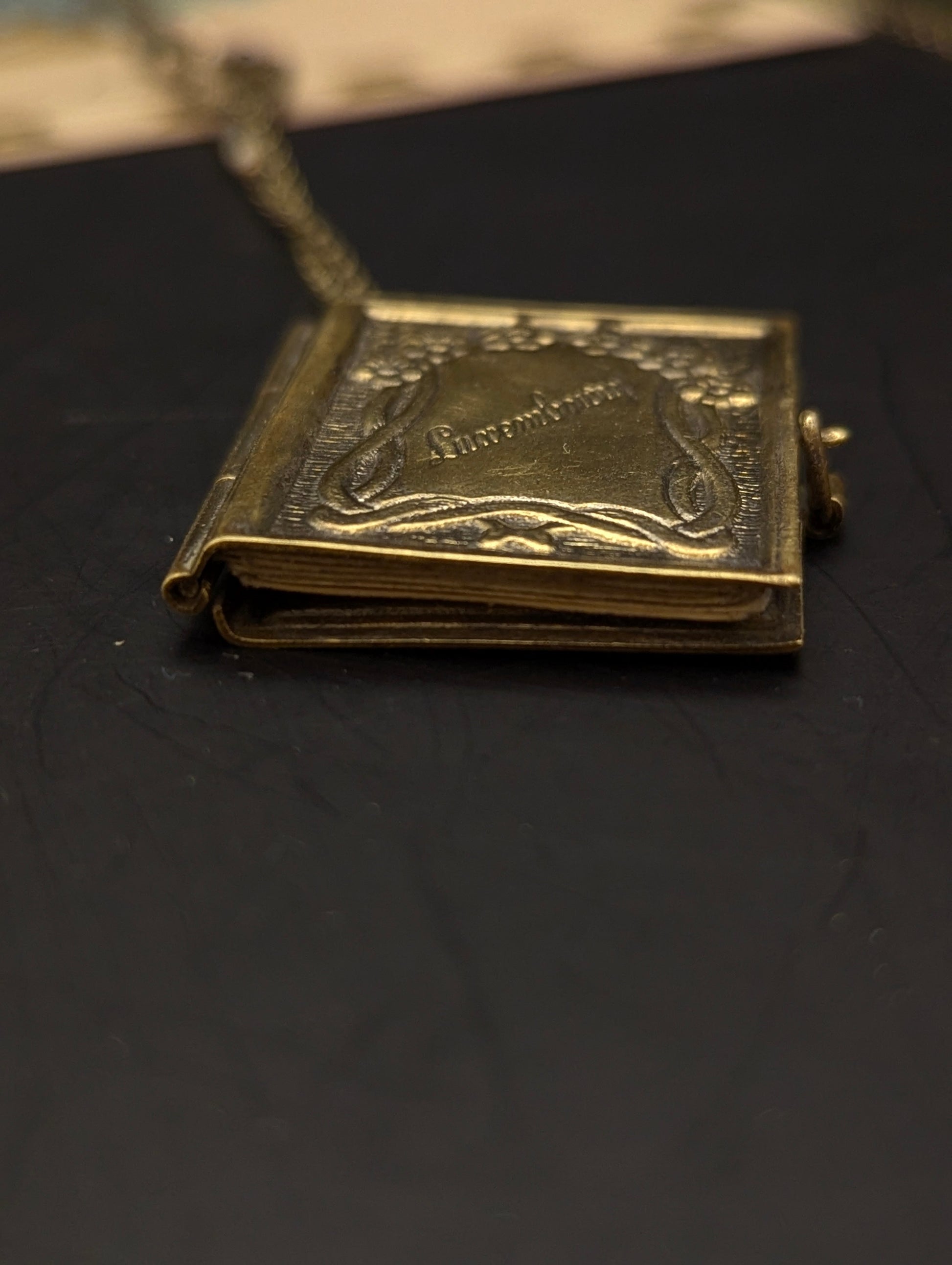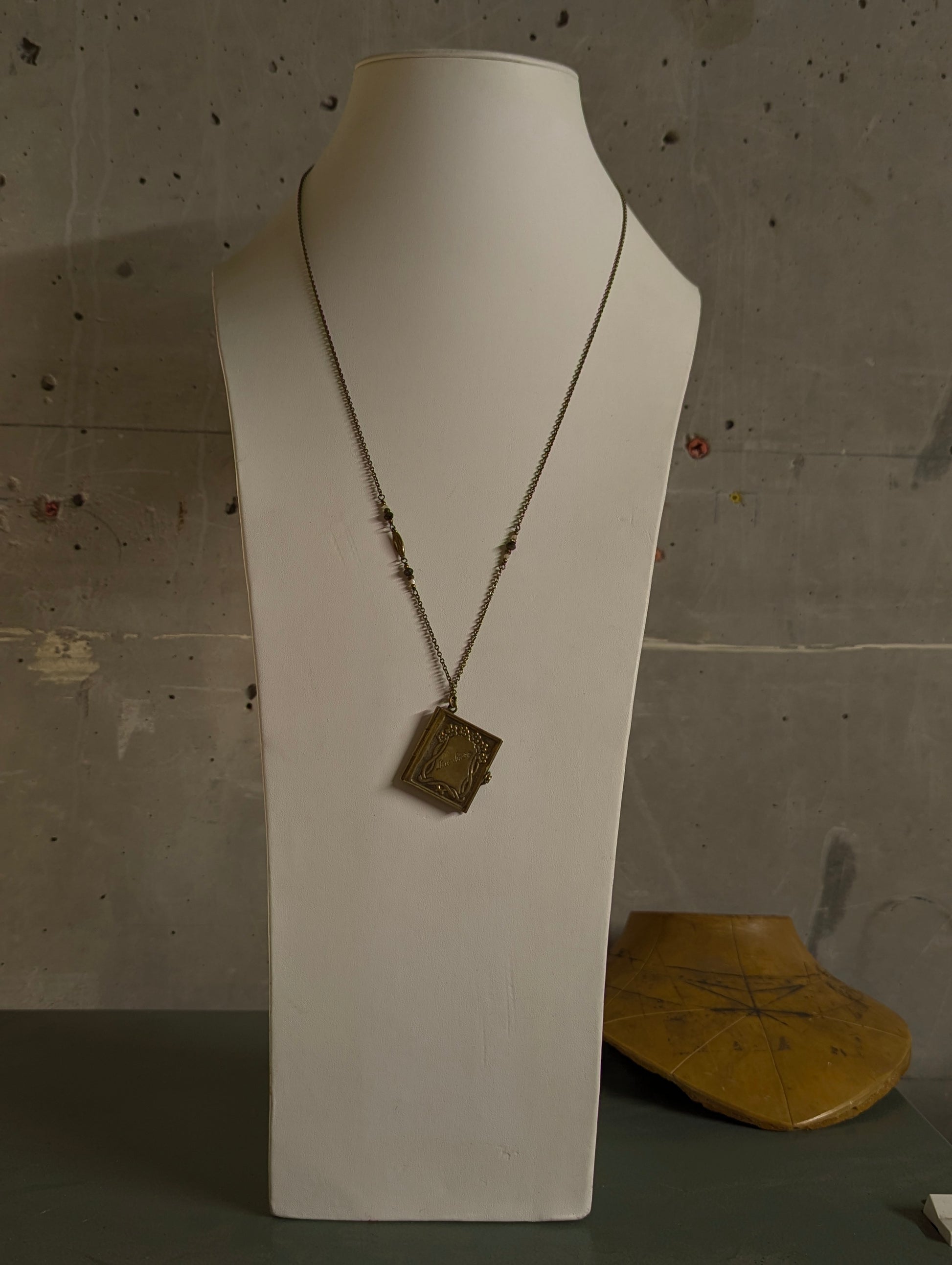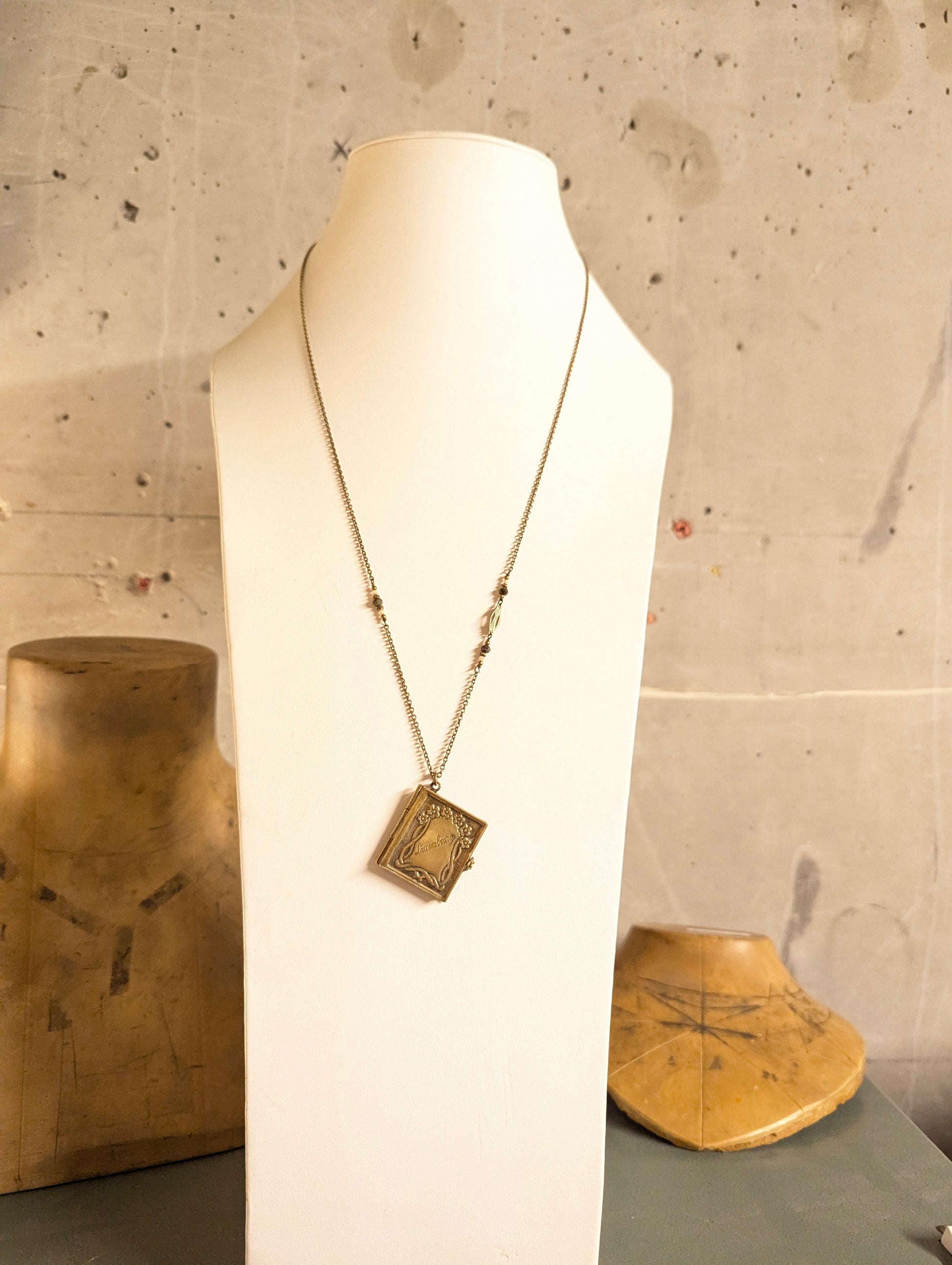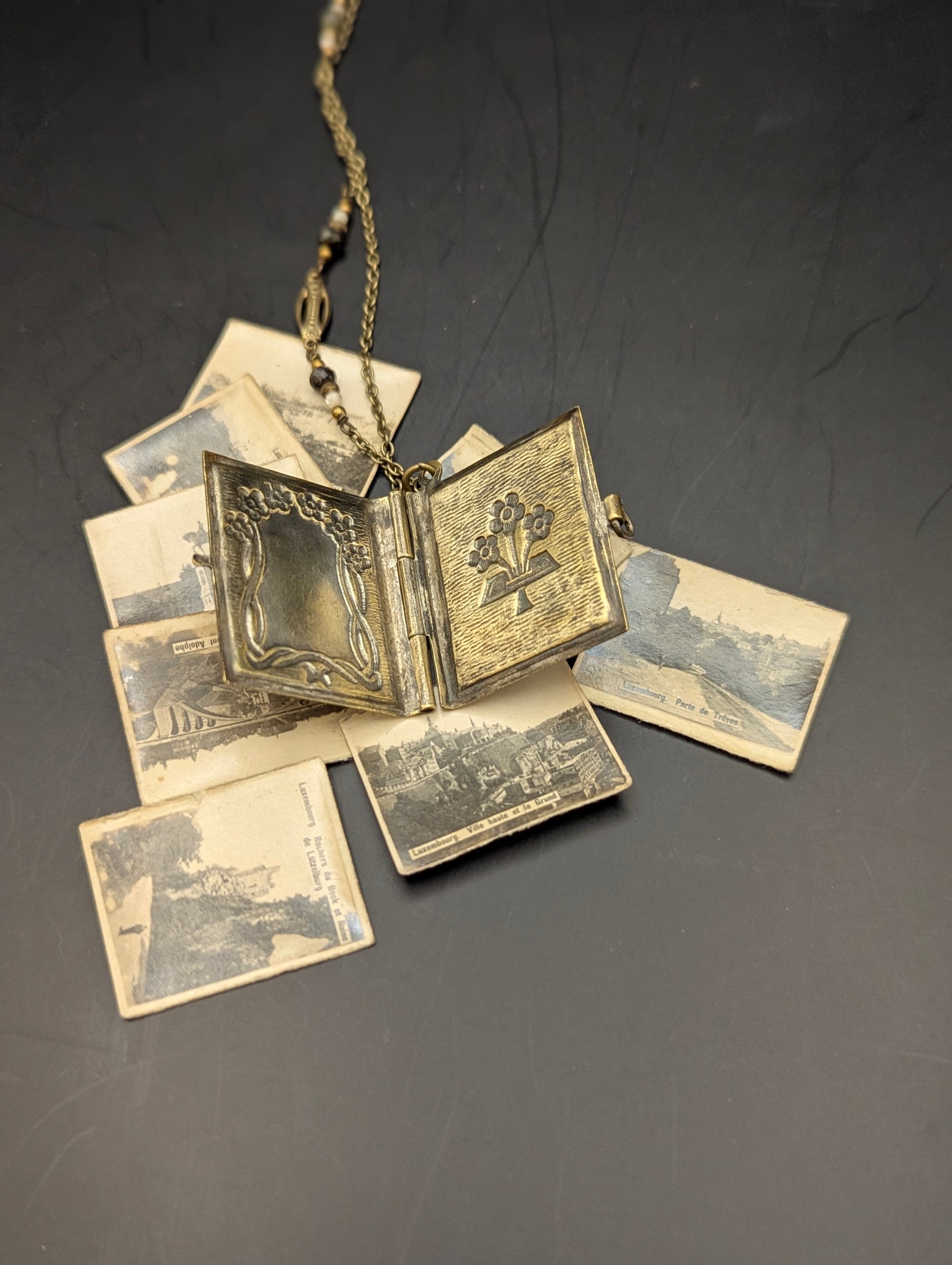 ベルギーの蚤の市で見つけた真鍮製のミニブック(2.8×3×0.3cm)をペンダントトップにしたロングネックレスです。本の中にはルクセンブルクの名所写真が9枚収められており、開けば旅の記憶が広がります。あなたの大切な写真も入れてみてください。