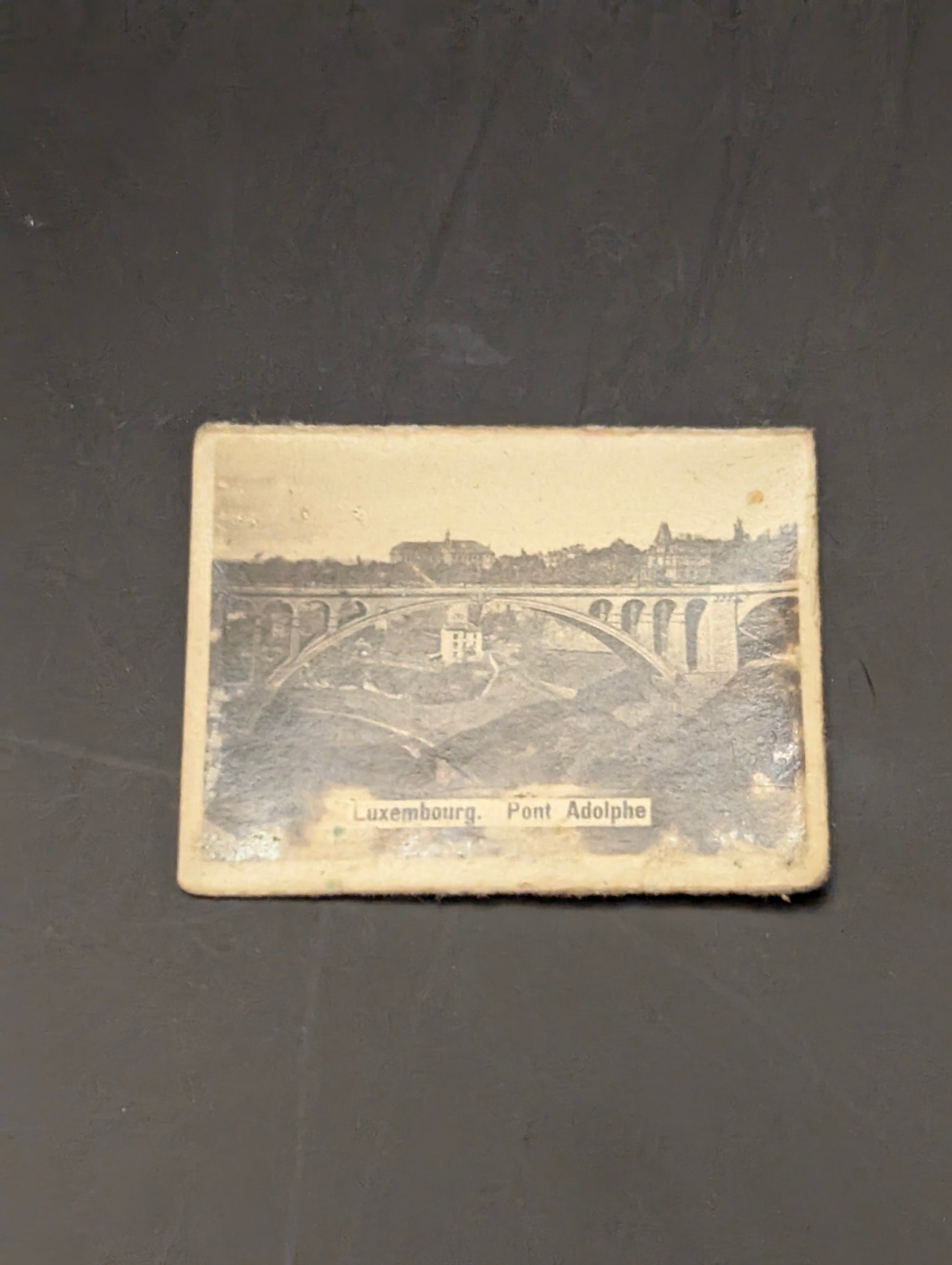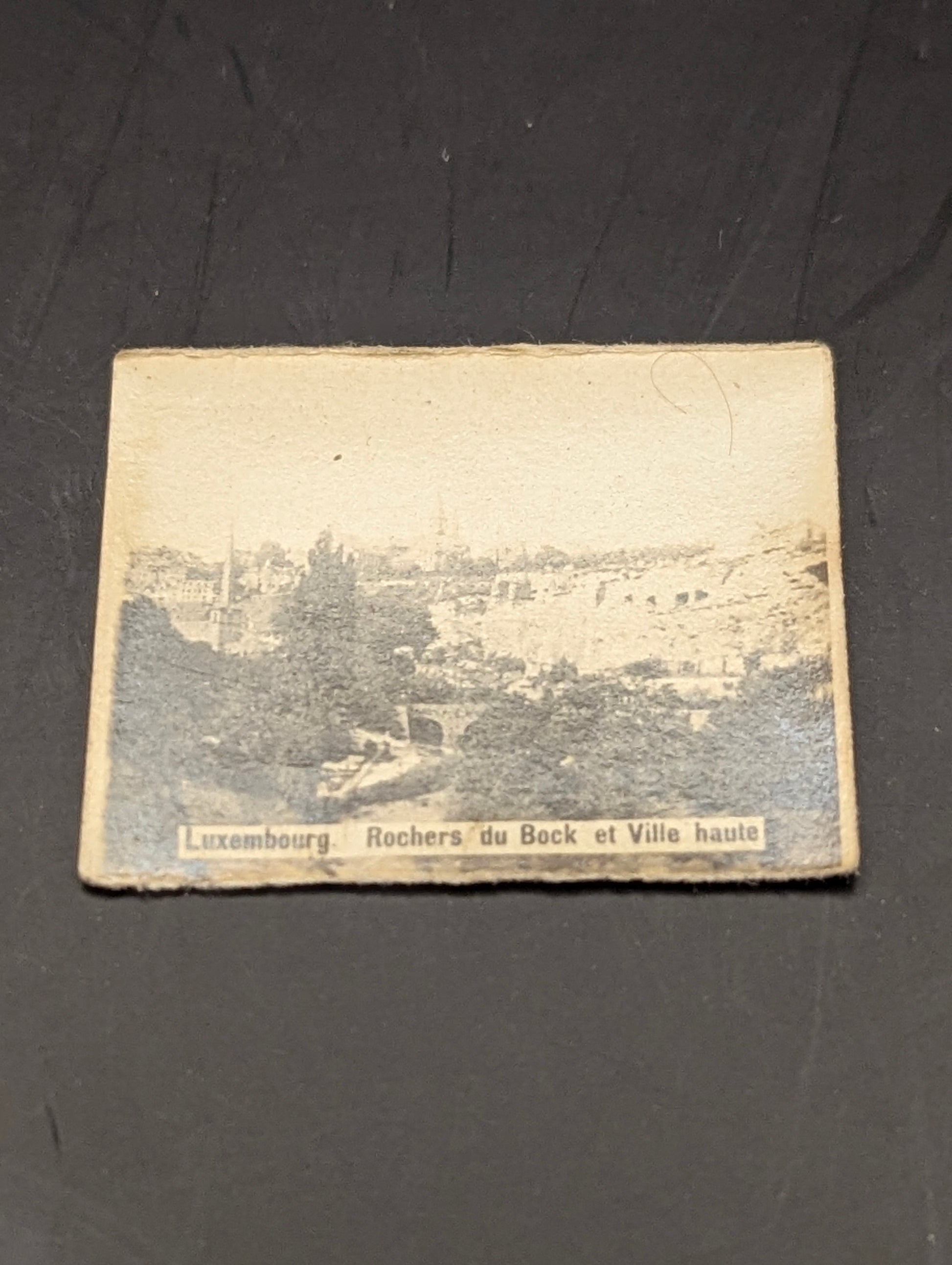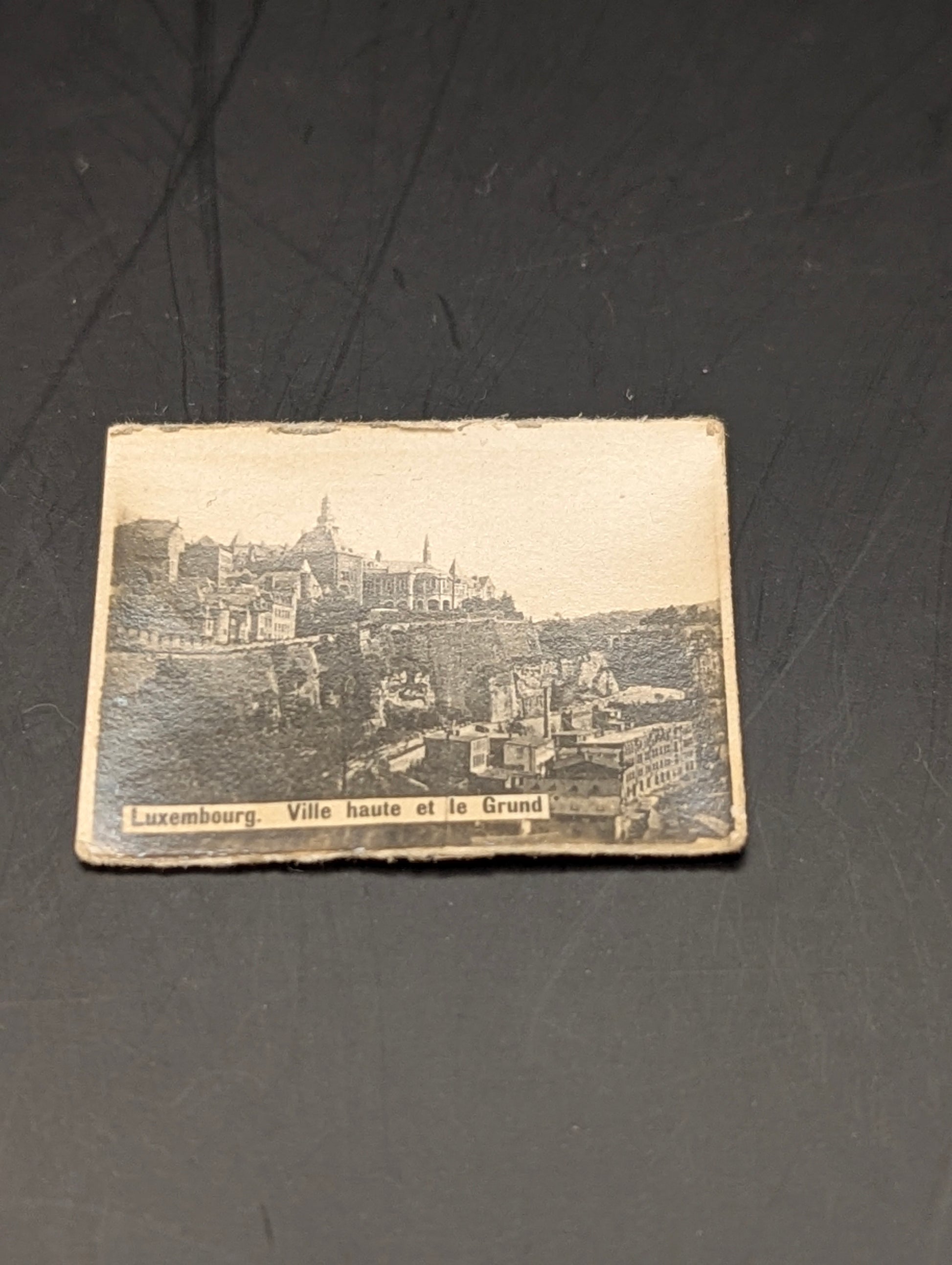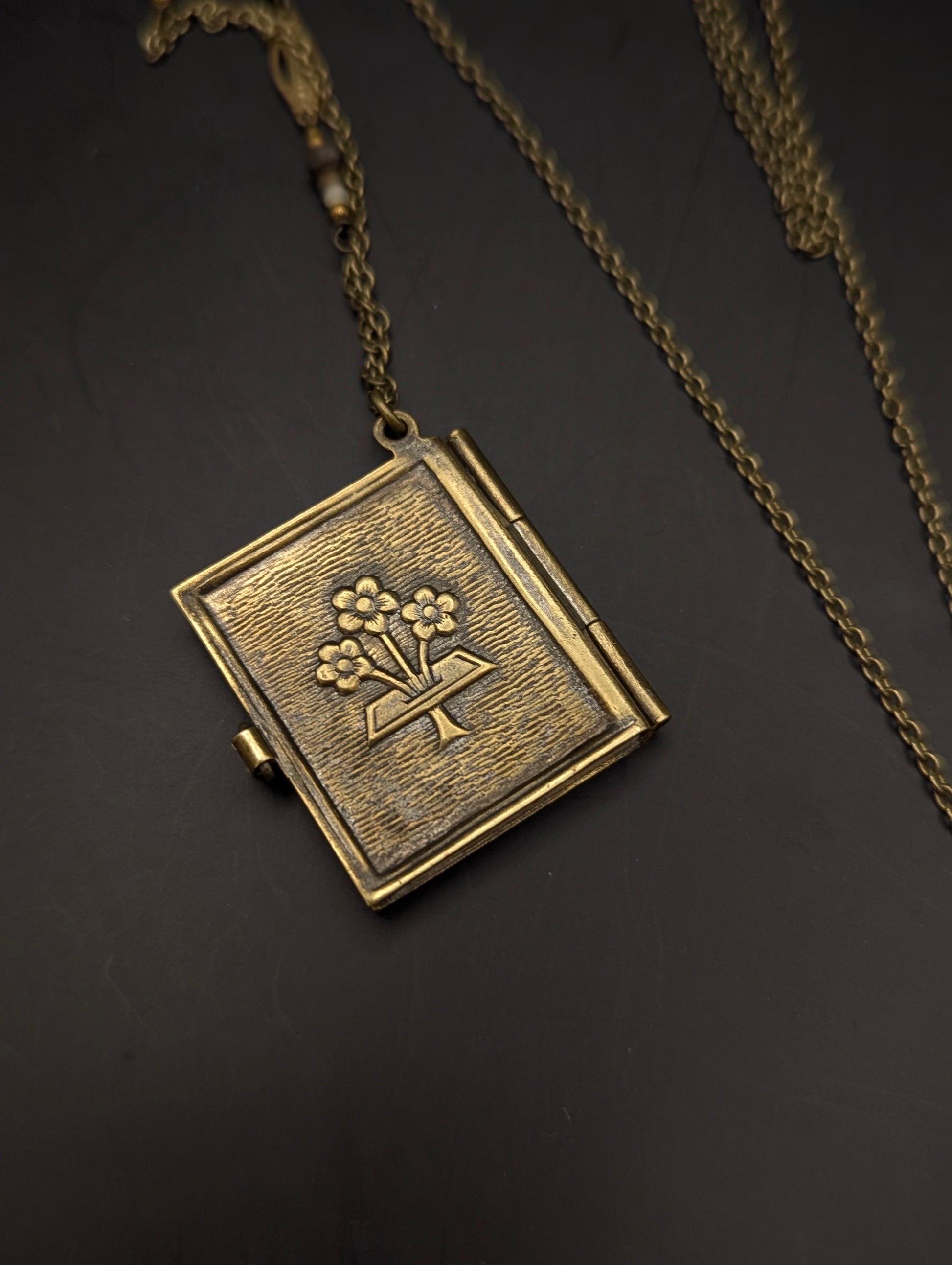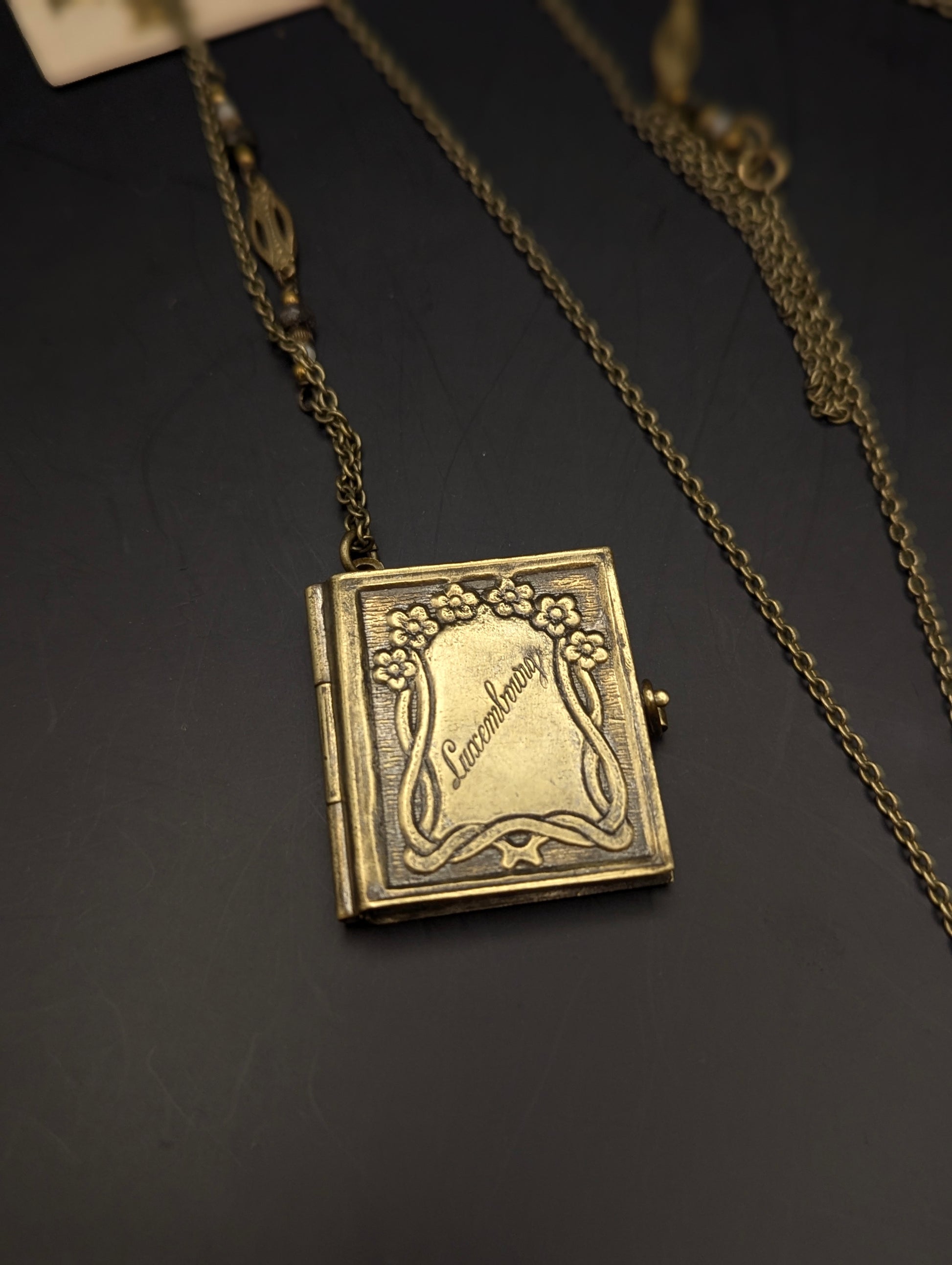 ベルギーの蚤の市で見つけた真鍮製のミニブック(2.8×3×0.3cm)をペンダントトップにしたロングネックレスです。本の中にはルクセンブルクの名所写真が9枚収められており、開けば旅の記憶が広がります。あなたの大切な写真も入れてみてください。