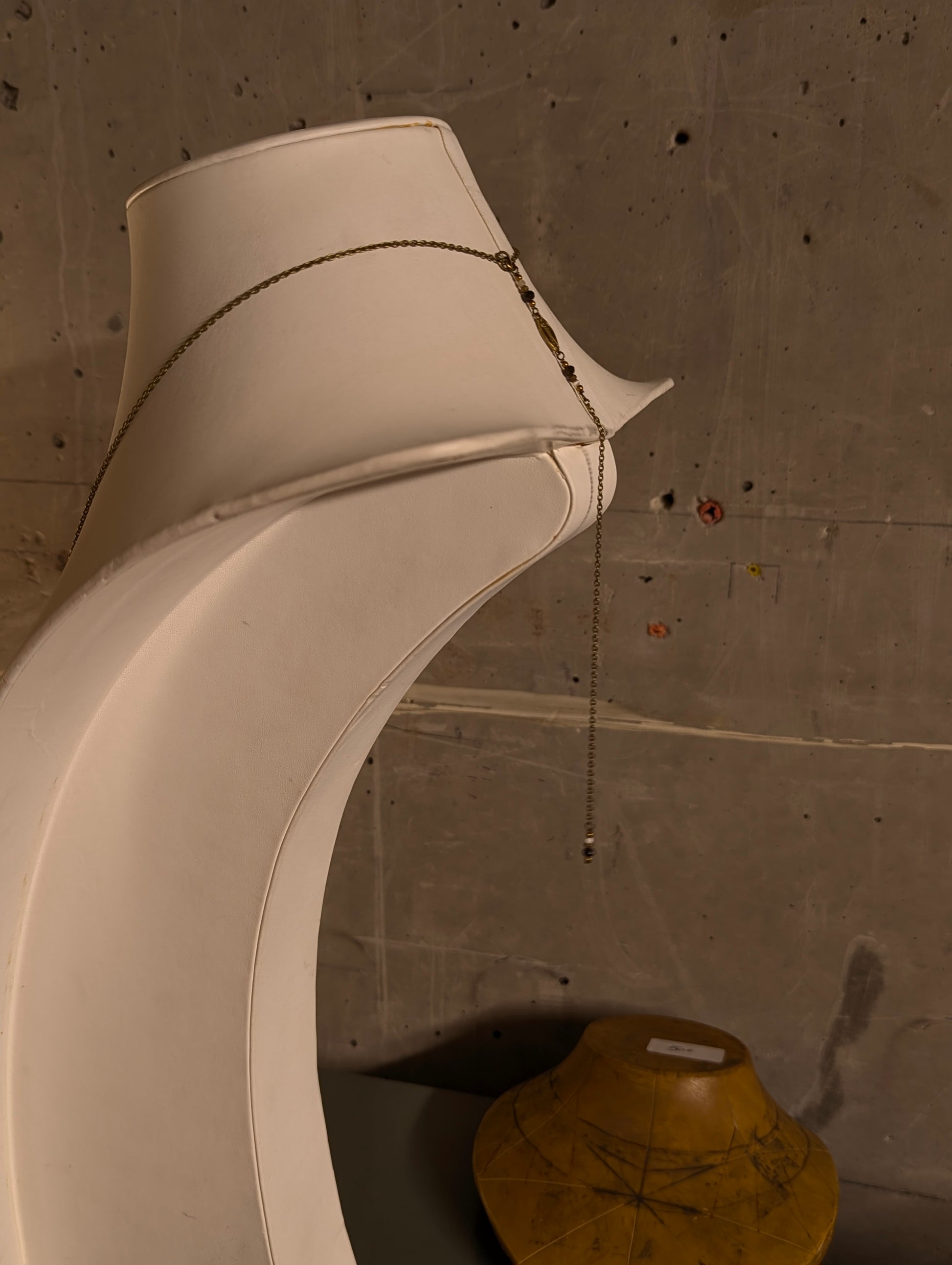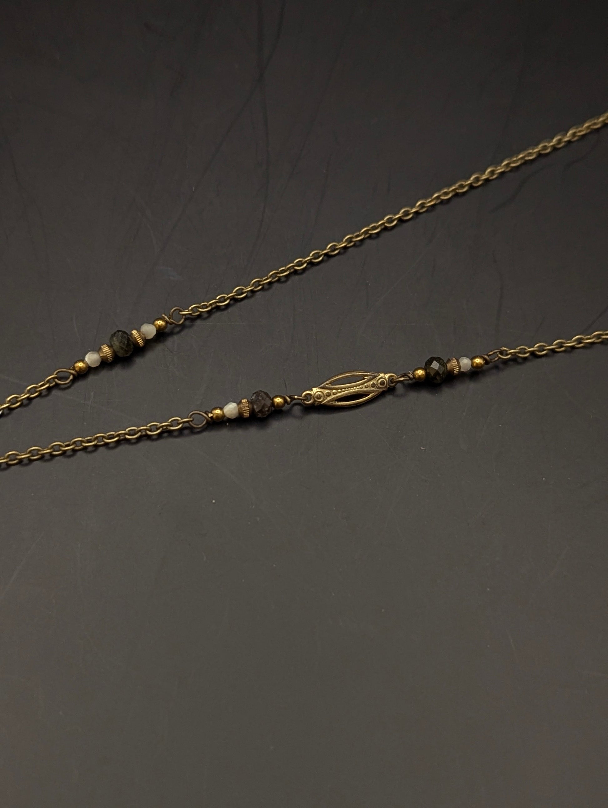 77cmの真鍮チェーンに18.5cmの背に垂れるチャーム付きで、後姿のポイントに。真鍮ビーズ、白蝶貝(マザーオブパール)、そしてトルマリンが彩りを添え、アンティーク感と上品さを兼ね備えています。
