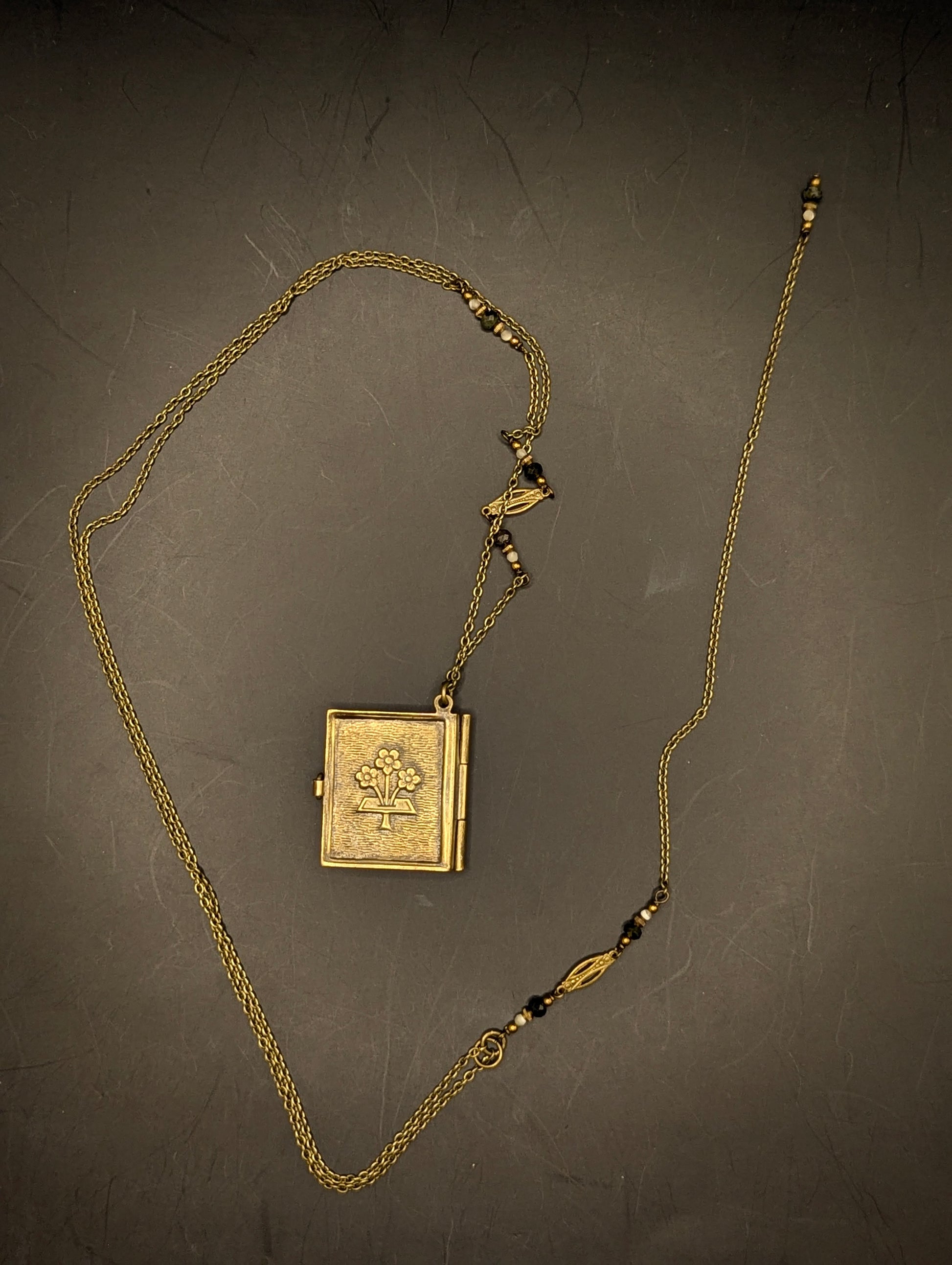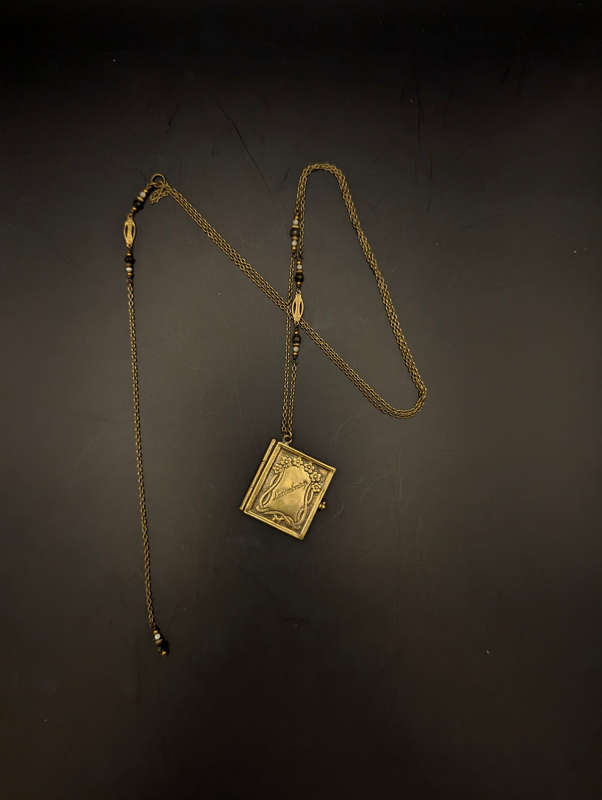 ヴィンテージ本チャームのロングネックレス|ブラス・白蝶貝・トルマリン
